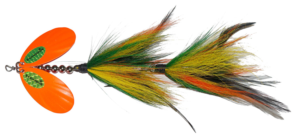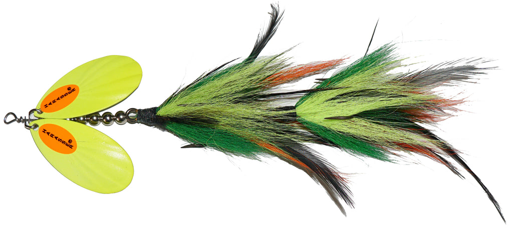 Mark Windel has done it again. Two generously tied and weighted bucktails are built on heavy wire with two 6/0 treble hooks. Top that off with twin spinning size 8 fluted blades and you’ve got one serious big fish bait. Windel’s ties some of the best color combinations in the business. No doubt about it the Double Mag is a great value in a giant sized bucktail.