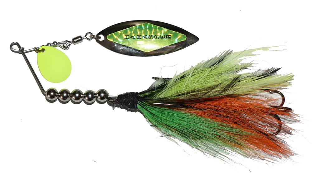 If you’re looking for a safety-pin style spinner with the fish hooking ability of treble hooks, look no further. This tandem spinnerbait is tied on a 5/0 treble with a 3/0 stinger hook. The overhead frame supports a Colorado and willow leaf combo on beefy .060 wire. Try crawling this one over deep submerged structure and get ready to slam those hooks home!