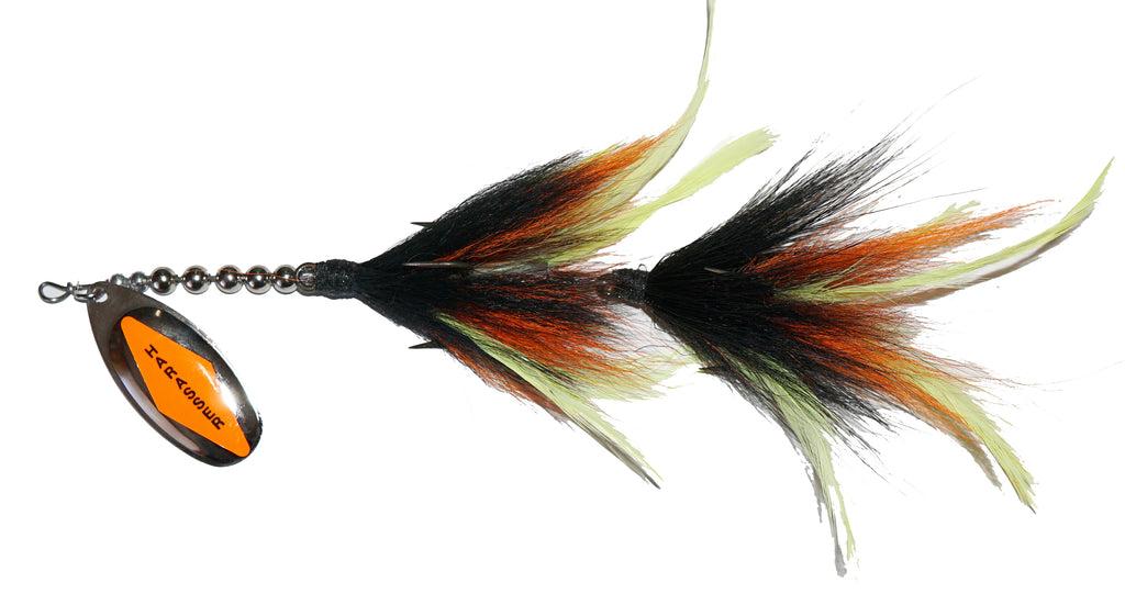 This super sized tail is expertly tied with two 7/0 treble hooks on extra heavy gauge wire. The big french blade will throw off plenty of flash.  Fish it fast or slow this tail will bring the beast out!