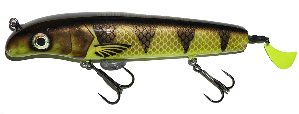 Introducing the NEW 9” bladed dive n rise. This baits features 9 inches of cedar wood body, new to the market this bait also features a size 5 hatchet blade of the back that flutters at every dive. The blade gives off the most distinctive sound and vibration off the back of each pull of the bait that no fish can resist. The 9” B-DNR also has the standard adjustable weight system in the bottom of the bait