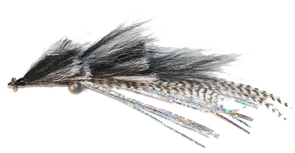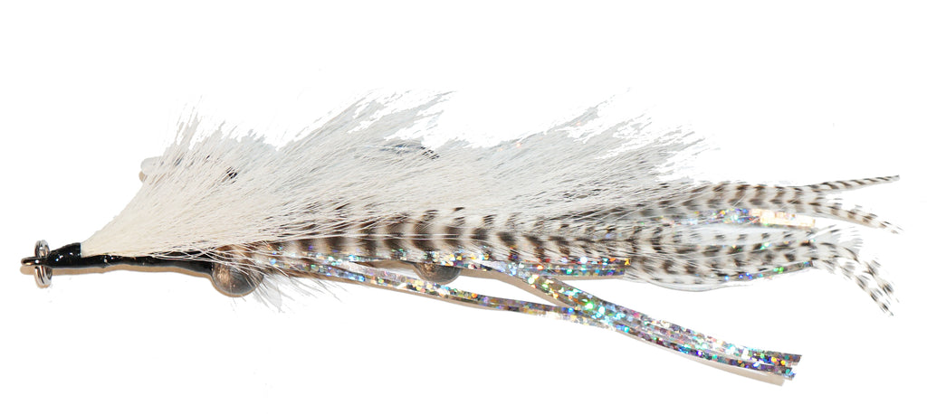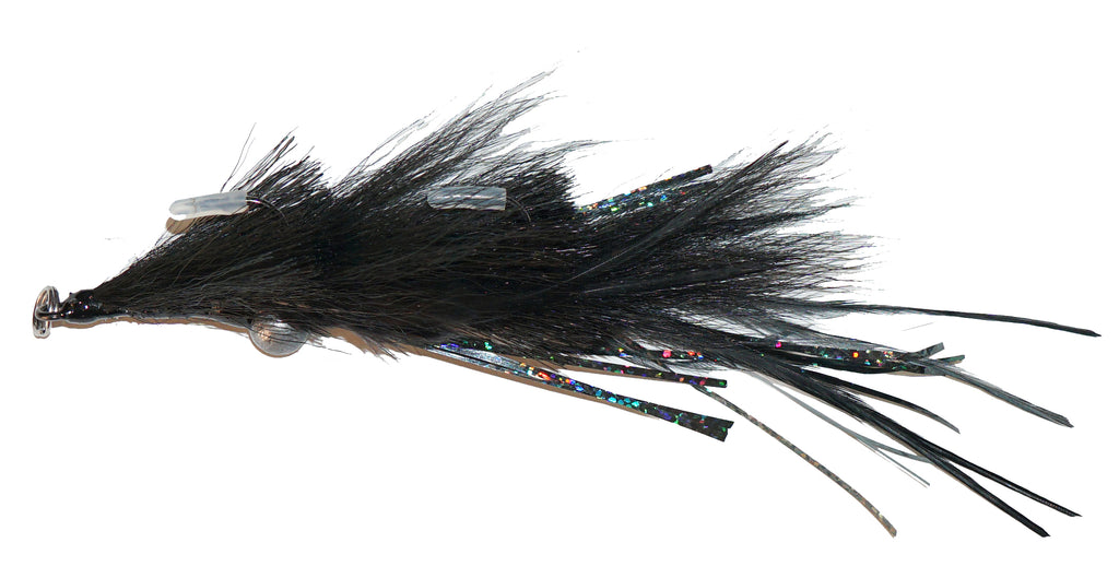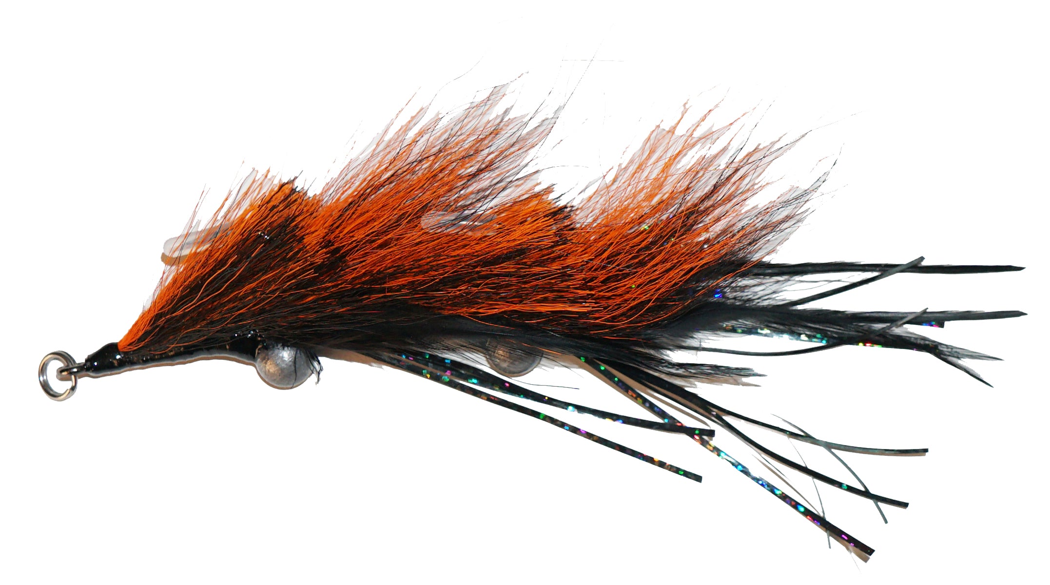 Behold the new Standard Castable Fly from Big Rock’s Tackle. This double, single hook design allows for efficient casting in the thickest of weeds, and downed trees. Both hooks are permanently secured, and weighted in the body. This forms a keel to ensure the hooks will ride upright, and ensure a level sink. All split rings are stealth tackle. This fly can be fished very fast, or very slow, with a pull pause technique, and slack line twitches. With an 8 inch profile, and the deadly combination of hair, feathers, and flash, the Big Rock’s standard castable fly is a top option for shallow water heavy cover musky fishing.