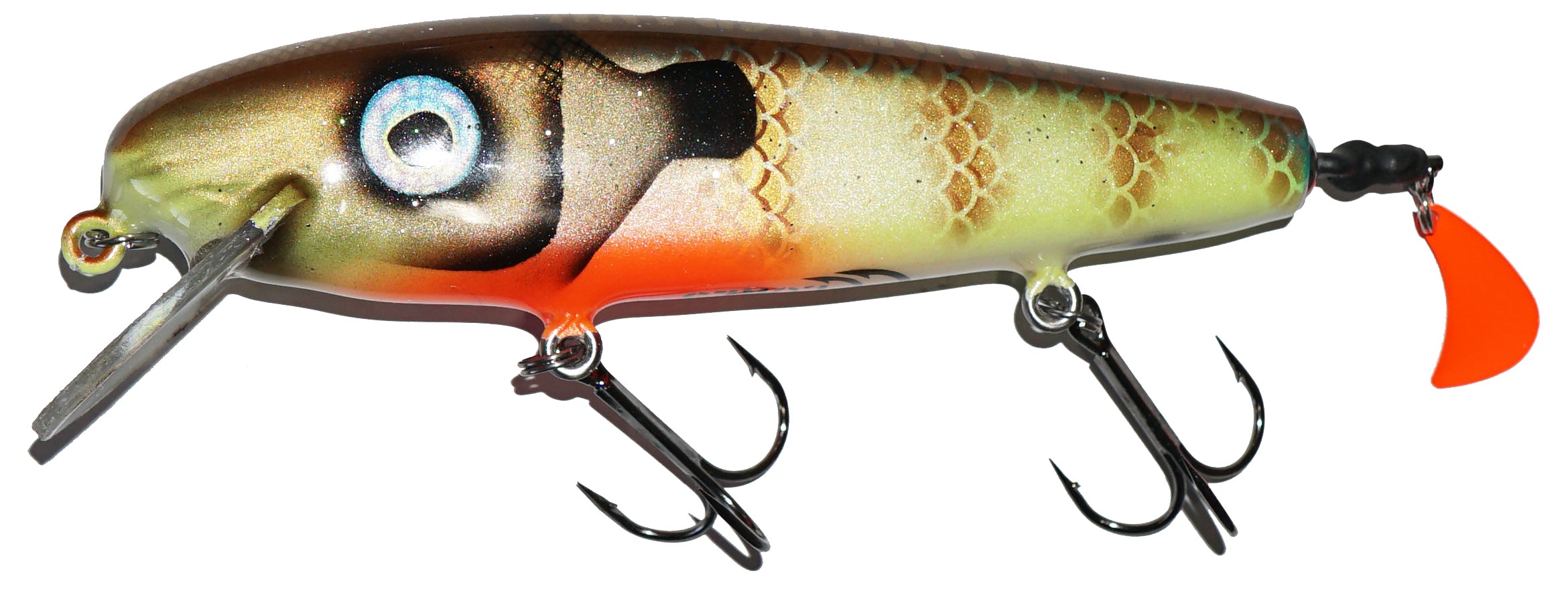 This Crankbait/Jerkbait features 6.5" inches of cedar wood body, new to the market this bait also features a size 5 hatchet blade of the back that flutters at every dive. The blade gives off the most distinctive sound and vibration off the back of each pull of the bait that no fish can resist. This bait also provides strength like no other, 4 epoxy clear coats to give you the strength to put this bait in hundreds of big muskys mouths.