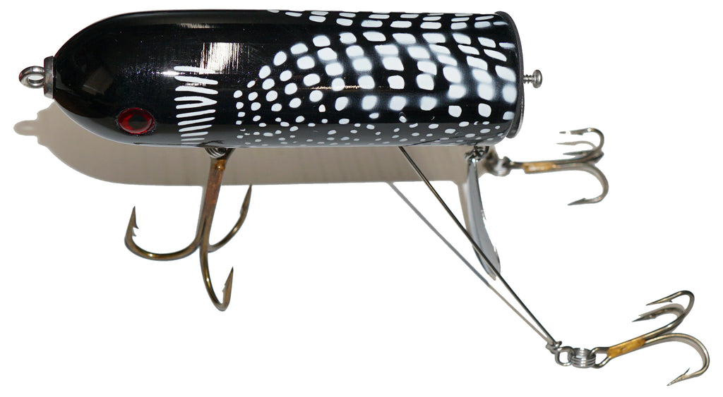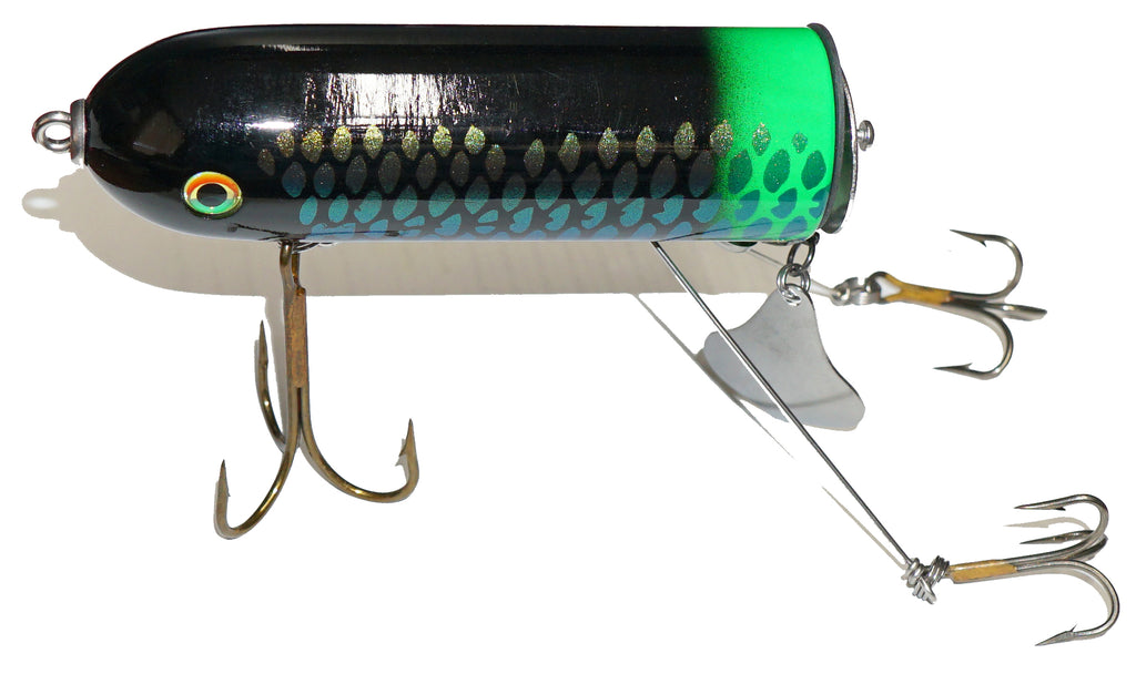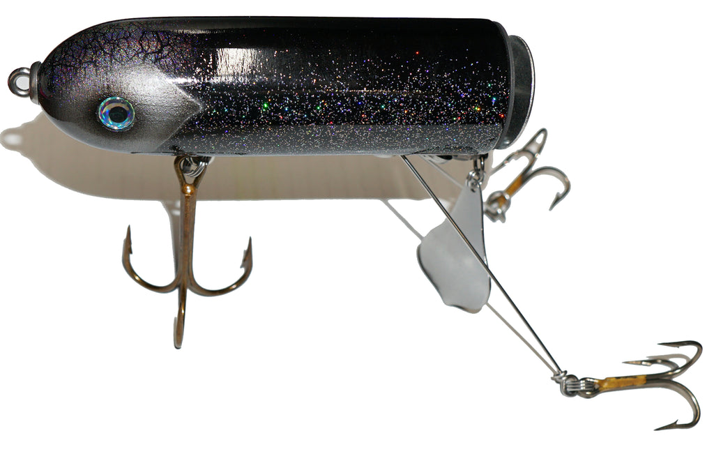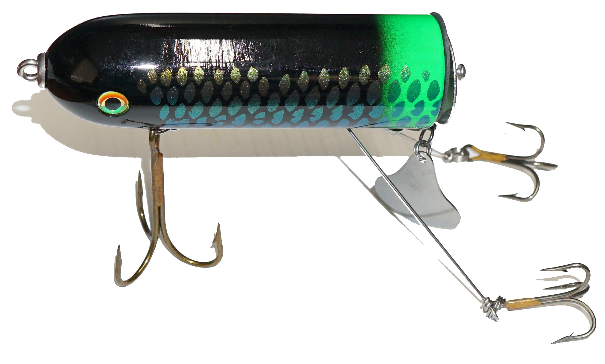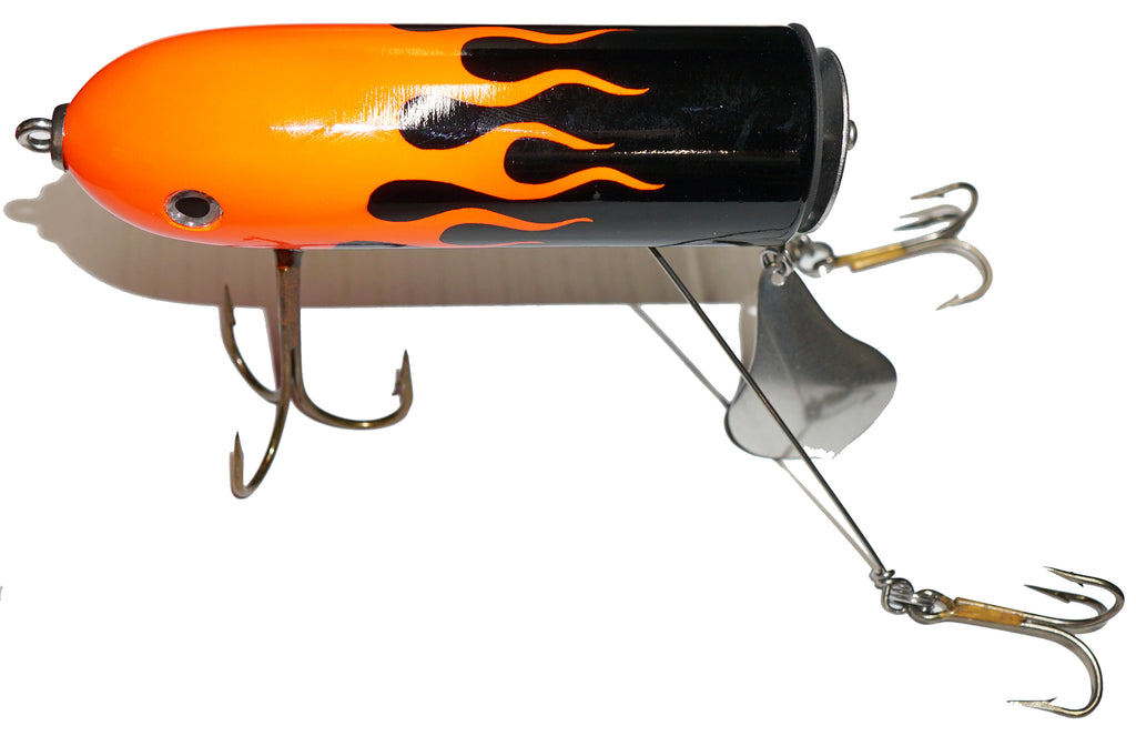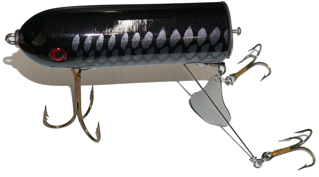With it's 5" cedar wood body and stainless flap blade the overall length comes in at 7". Size 7/0 Mustad 3551 in front and two 2/0 Eagle Claw 774 trebles hang from custom replaceable "spreaders", hook and hold like no other design. The classic stainless flap blade rotates and spins extra freely from a high quality ball bearing swivel. Wanna throw something they haven't seen? Well, you have found it!