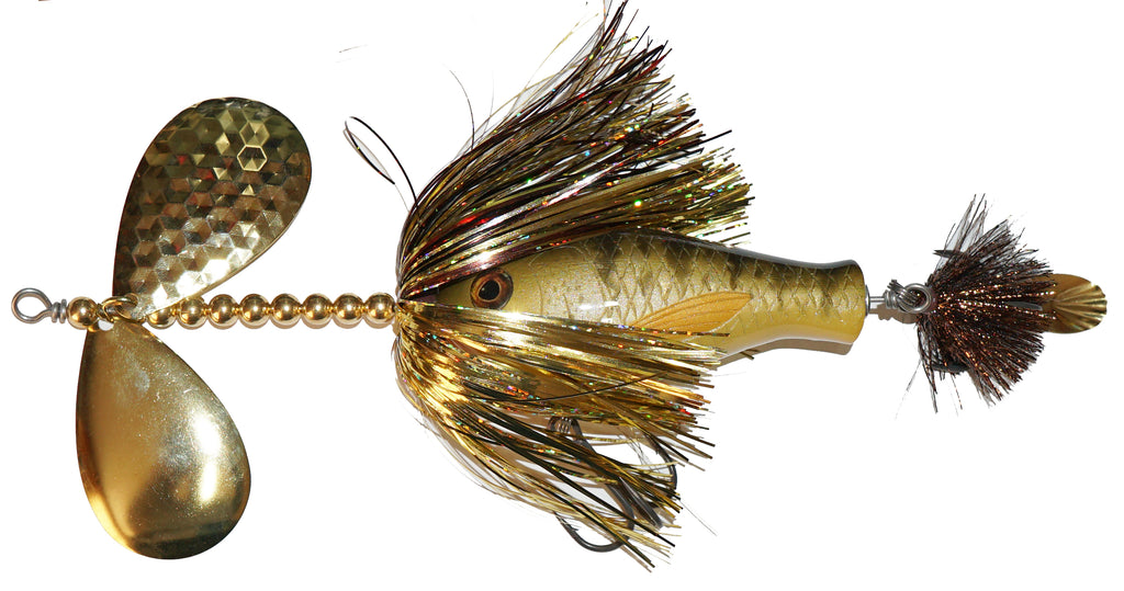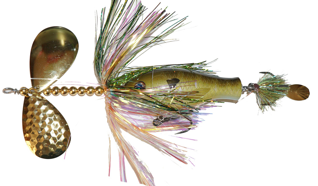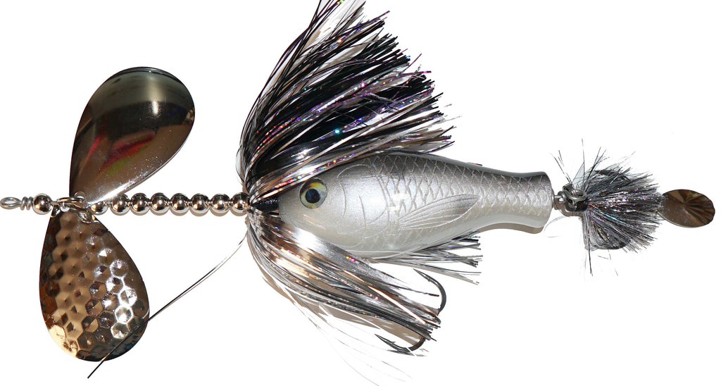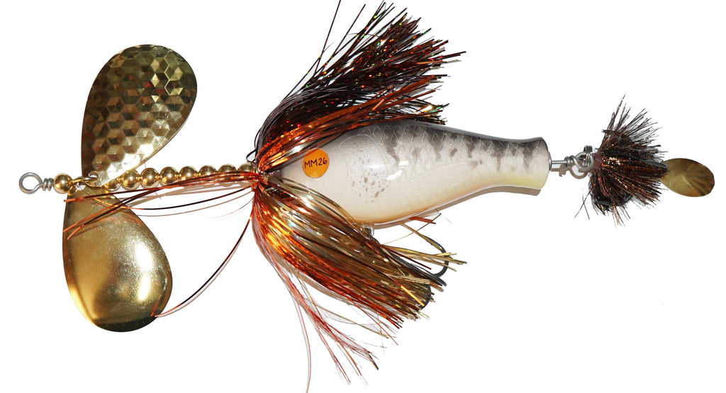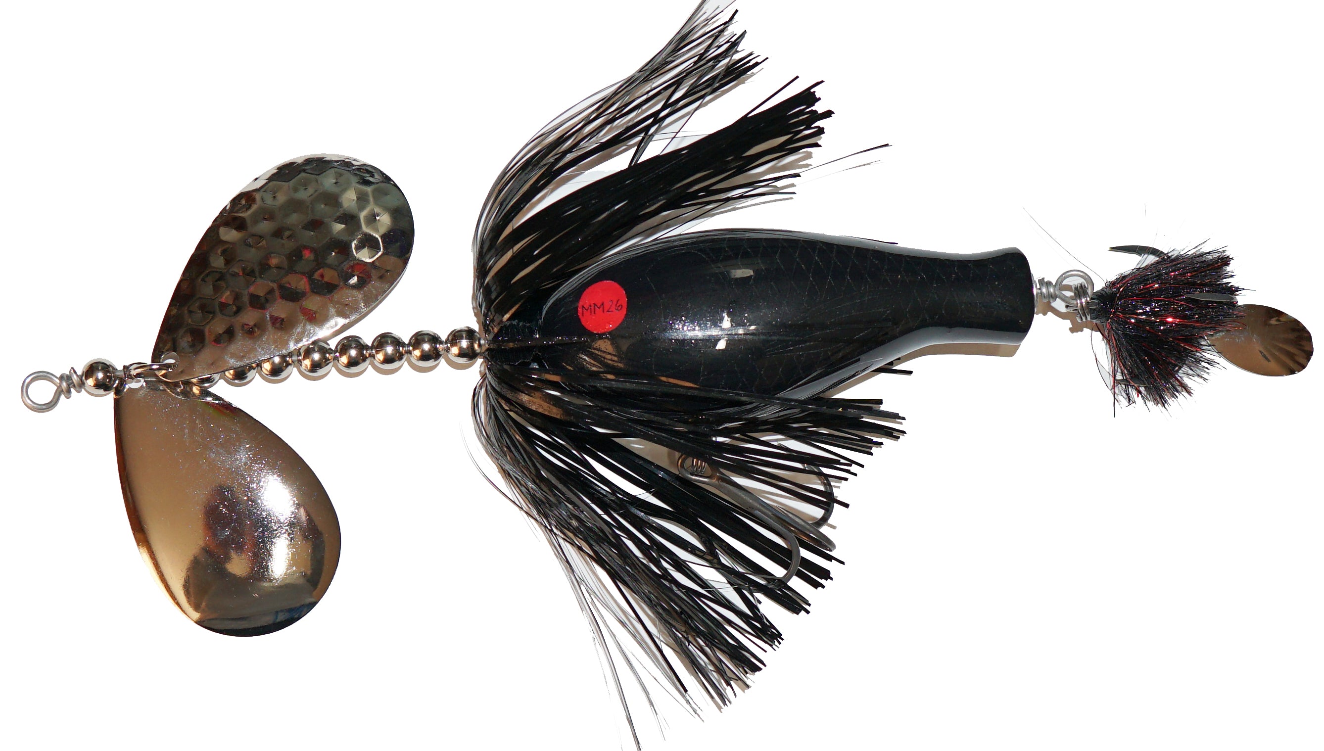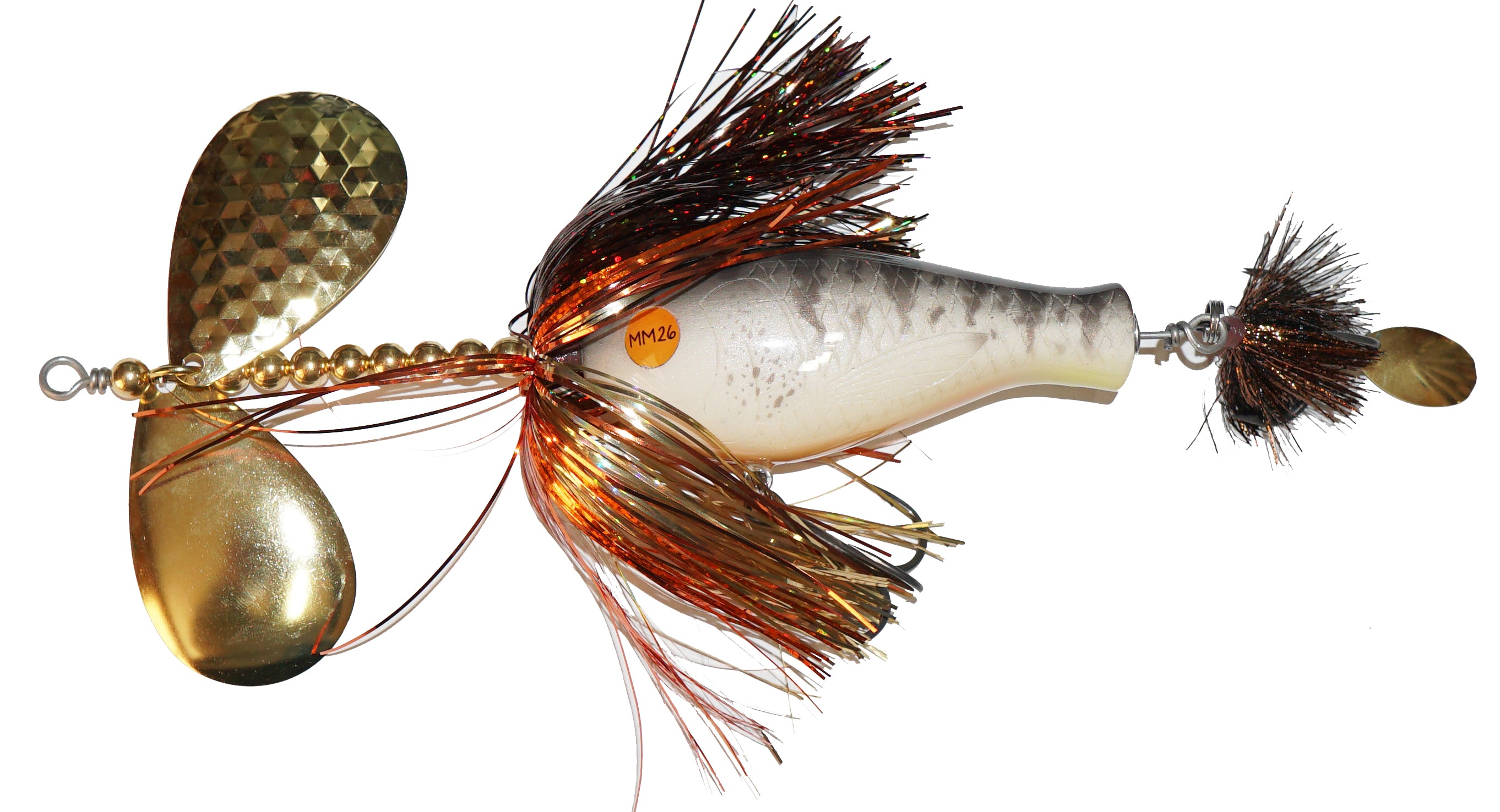 The MM26 Blade Knocker is a shad-shaped float-body bucktail lure. The hand-carved body of the bait rotates freely on a .062” stainless steel shaft. Unlike other float-body bucktails, the Blade Knocker is built with a one-knocker system inside its freely rotating, hand-carved, shad-shaped body. A 3/0 BKK Spear 21 treble hangs from the belly of the shad-shaped float body. The rear hook hanger is equipped with an in-shop custom-built 3/0 BKK Spear 21 ball bearing swivel hook. Each rear-dressed ball bearing swivel hook comes equipped with a hand-tied size 2 fluted Indiana blade. Upon initial retrieve of the Blade Knocker, the lead blade combination will instantly begin to spin on a size 6 dual-blade clevis. The shad-shaped body will float the bucktail on retrieve in a head-down posture. The size 2 fluted Indiana blade keeps the rear treble in proper strike position at all times during retrieve. The Blade Knocker sinks at a super slow, approximate 4 feet per 10 seconds. The Blade Knocker can be fished at all speeds, from slow rolling to waking on top.