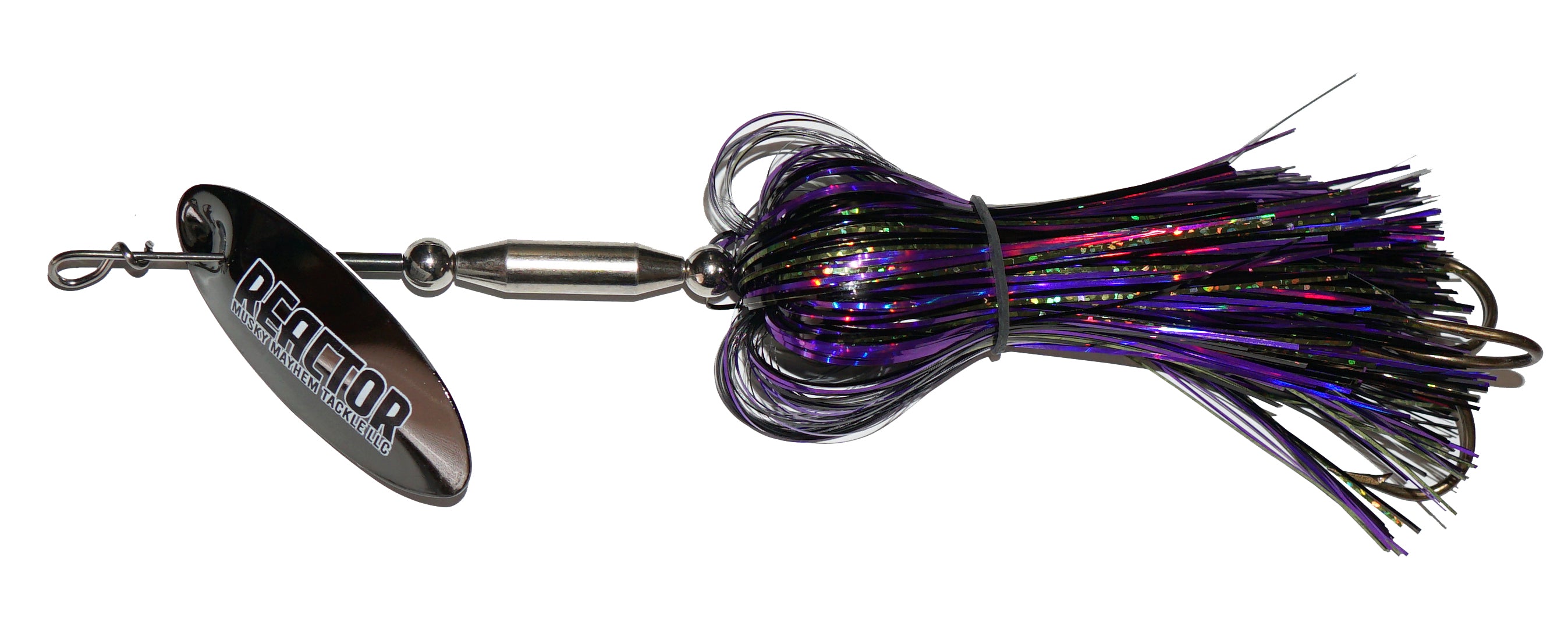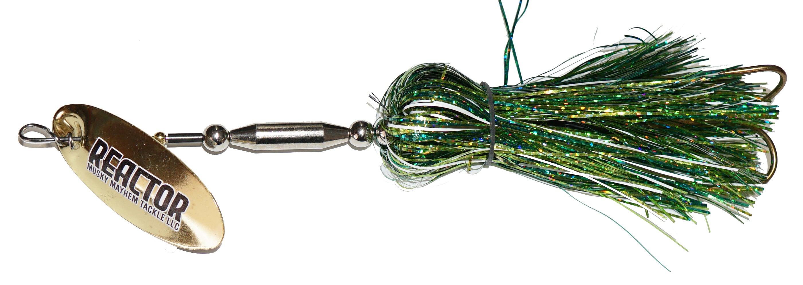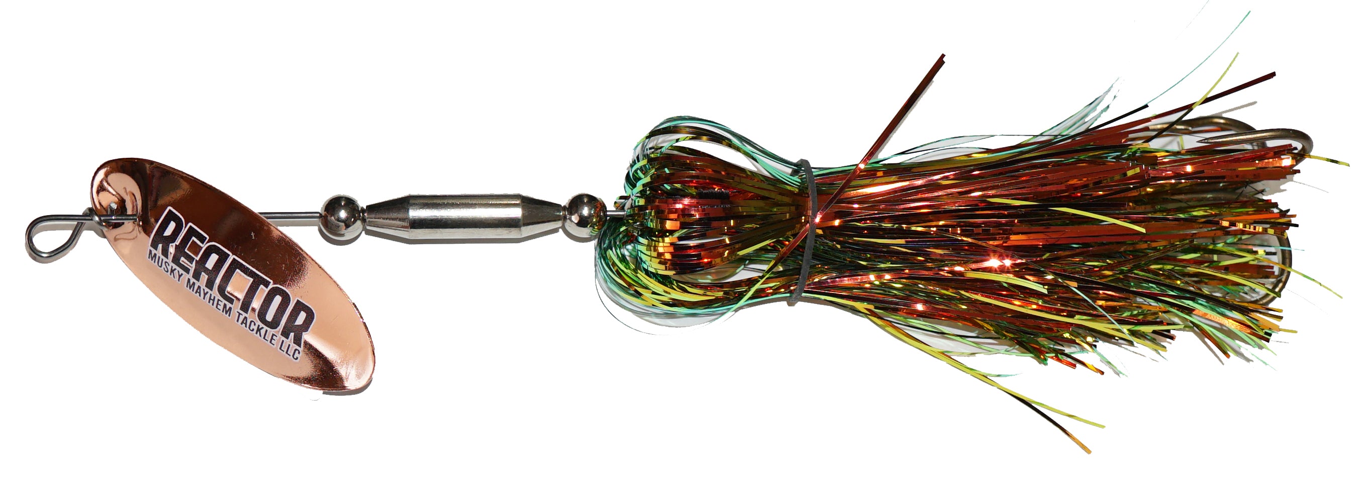This new speed bucktail from Musky Mayhen features an in-line blade, single oversized treble hook and flashabou skirt. Easy pulling and easy to start blade means covering water just got easier.