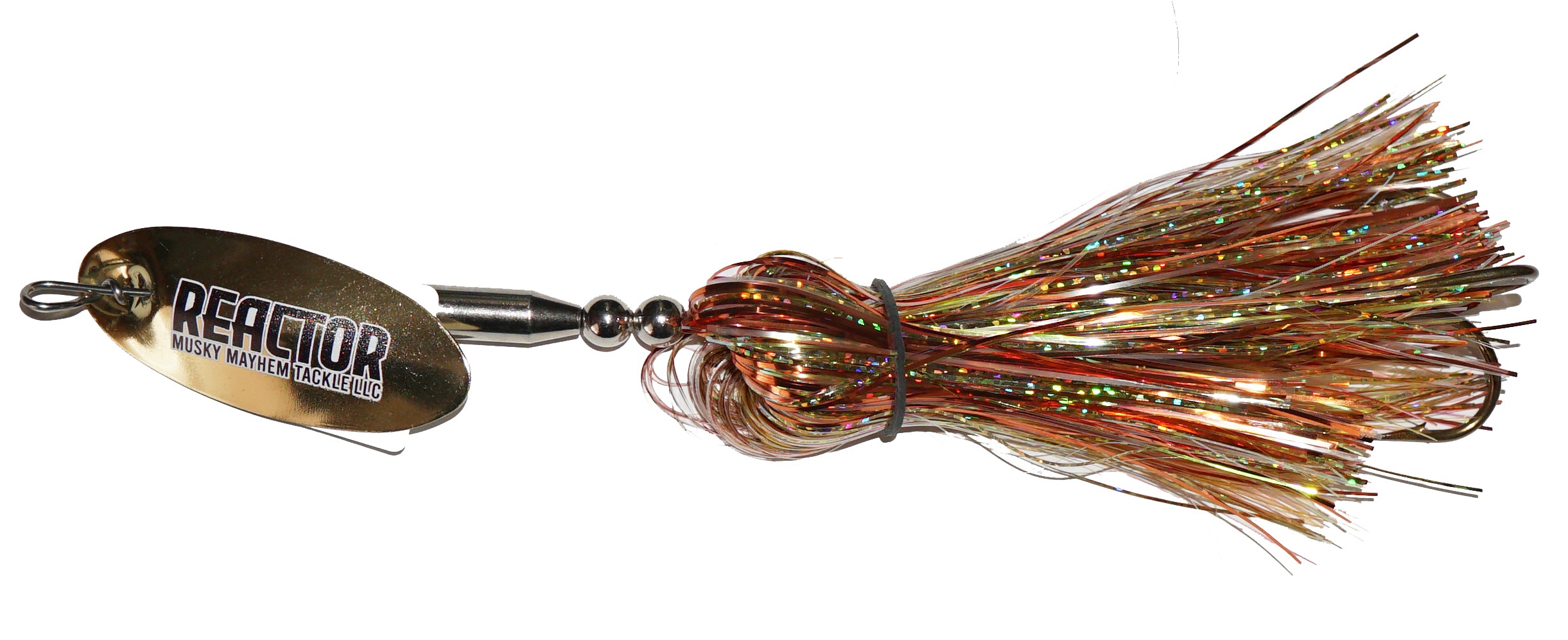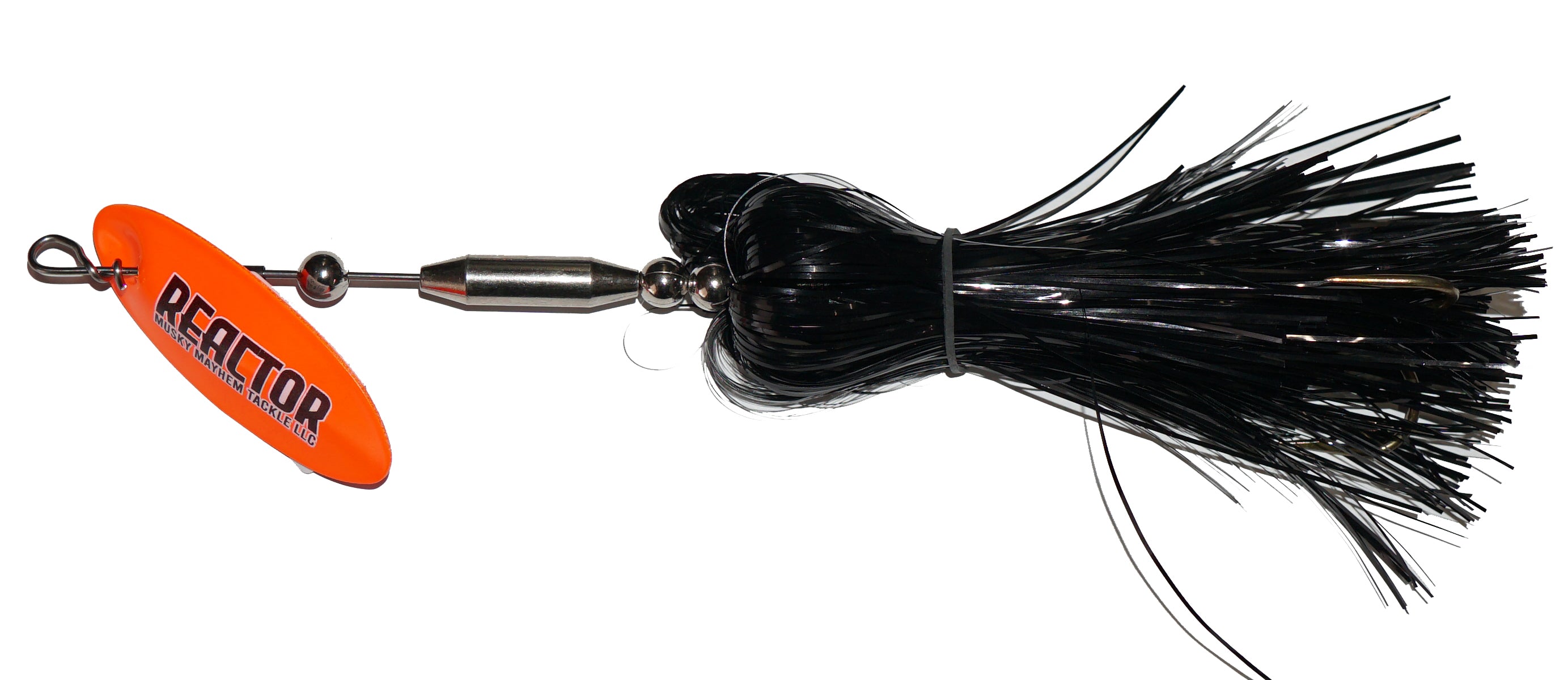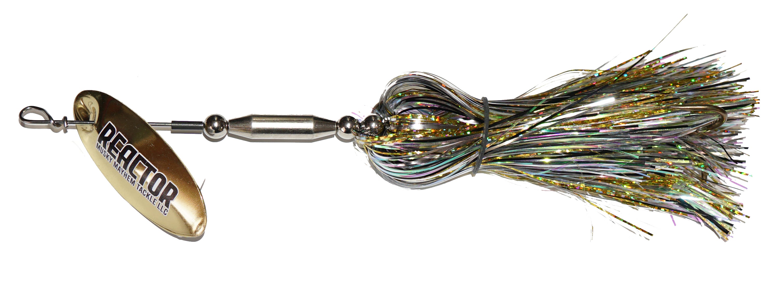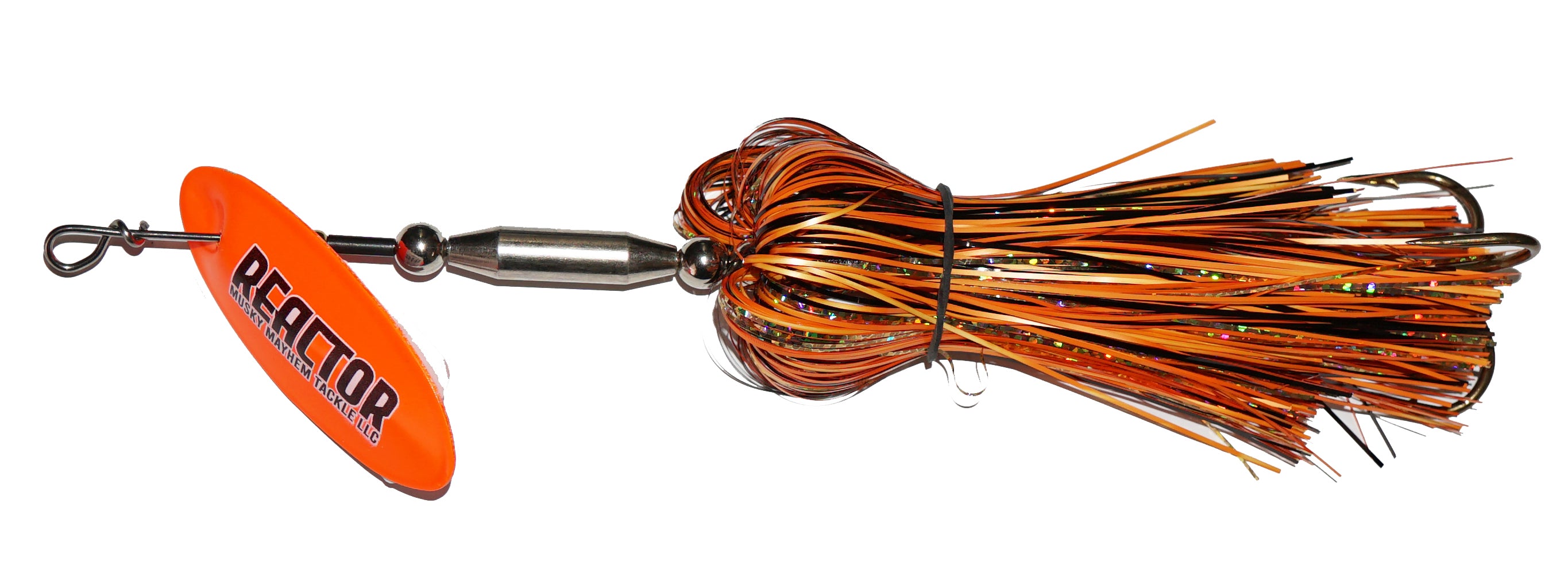 This new speed bucktail from Musky Mayhen features an in-line blade, single oversized treble hook and flashabou skirt. Easy pulling and easy to start blade means covering water just got easier.