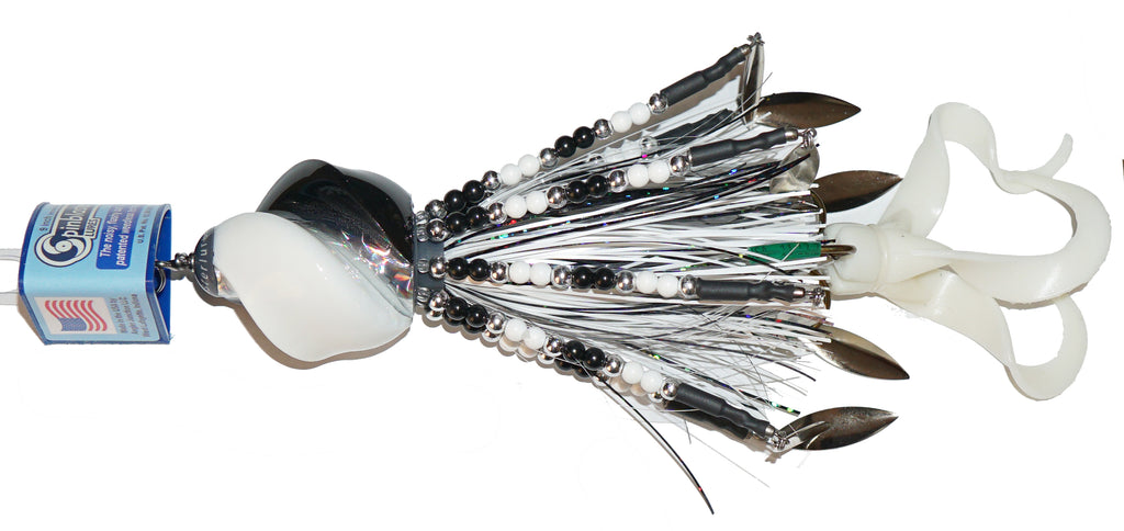The lure body is epoxy coated and available in a variety of color combinations. Spiral channels cause it to spin through the water and present a constant flash of color. An internal chamber filled with ball bearings generates a rattling vibration as it spins.