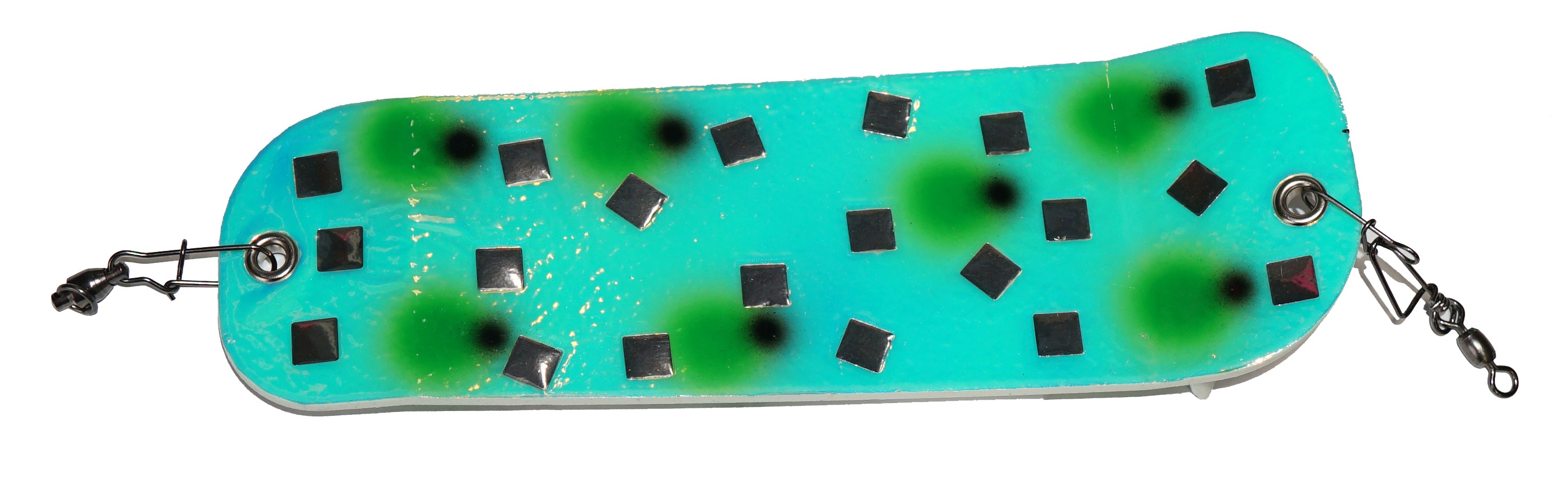 Designed to offer perfect rotating action for salmon trolling rigs at variable speeds and draw fish in from distance with its unique embedded mirrors to create bursts of flashing light throughout the water column. Finished in the Best Glow In Fishing from Moonshine Lures.