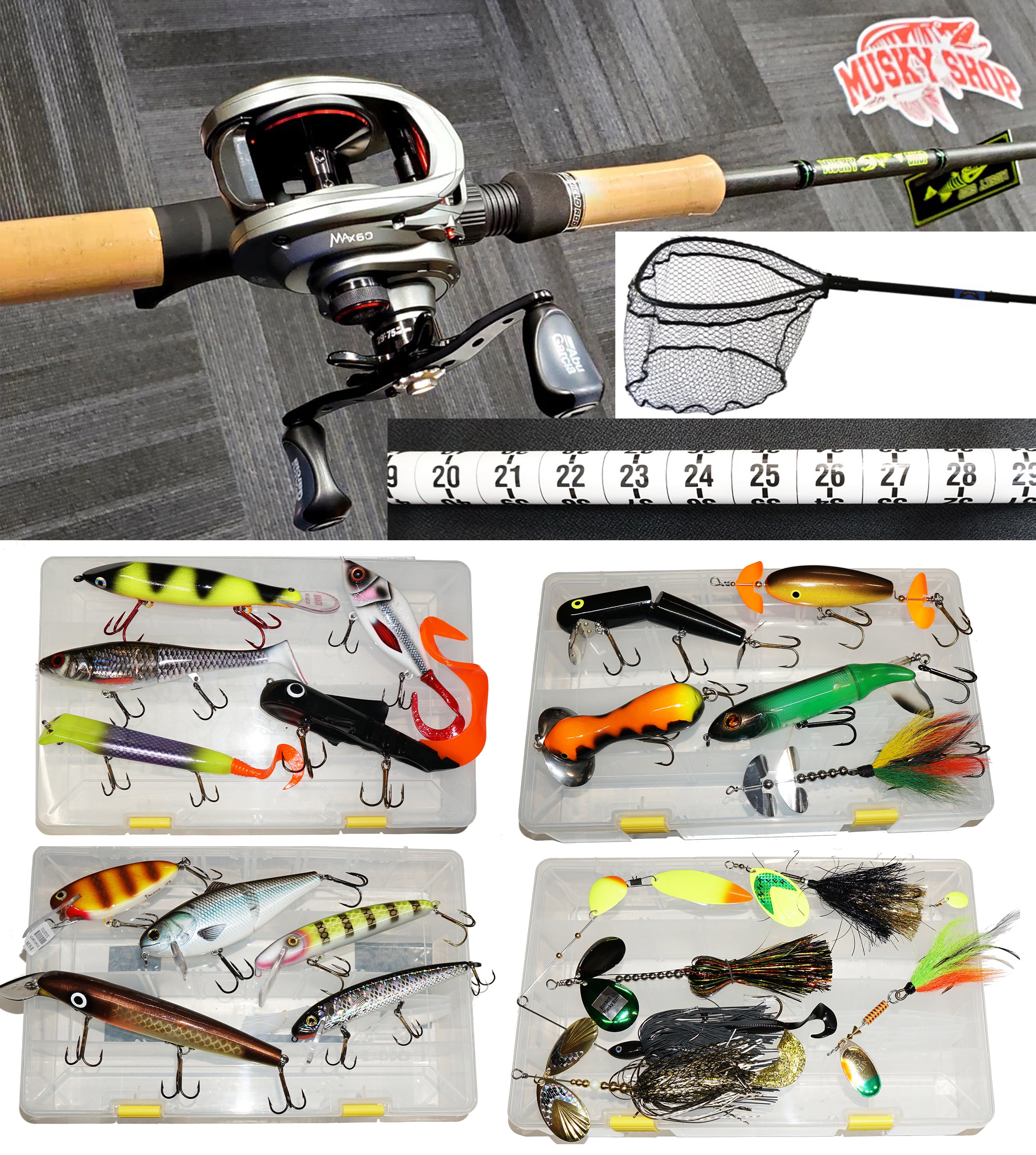 The Bucktail kit includes a Mepps Muskie killer, Acebaits Original Spinnerbait, Inhaler 70 Firefly, Hooked On musky Bomb, Figure 8 Enforcer and a Plano 3730 Tackle Box.