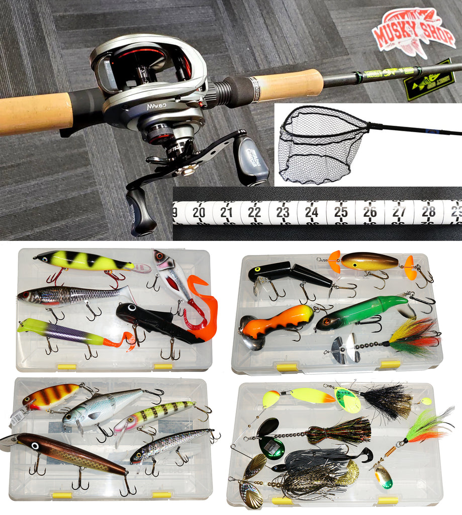 This is the perfect set up for the musky angler looking for an awesome recommended pack that includes rod/reel, line/leader, 20 musky lures, 4 Plano Boxes, net and 60" floating fish ruler! This special pack includes:
